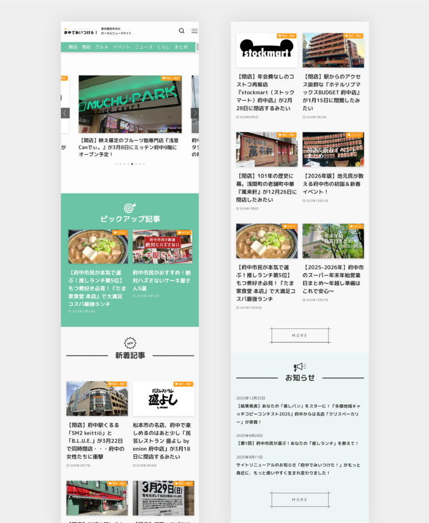 記事コンテンツを中心に、イベント・グルメ・地域ニュースなどを分かりやすく整理し、府中の魅力を発信できるポータルサイトとして再設計しました。